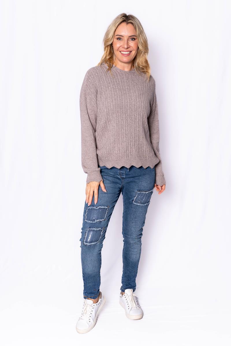 Alexia- Taupe- Soft knit fine rib pattern hoodie with scallop hem