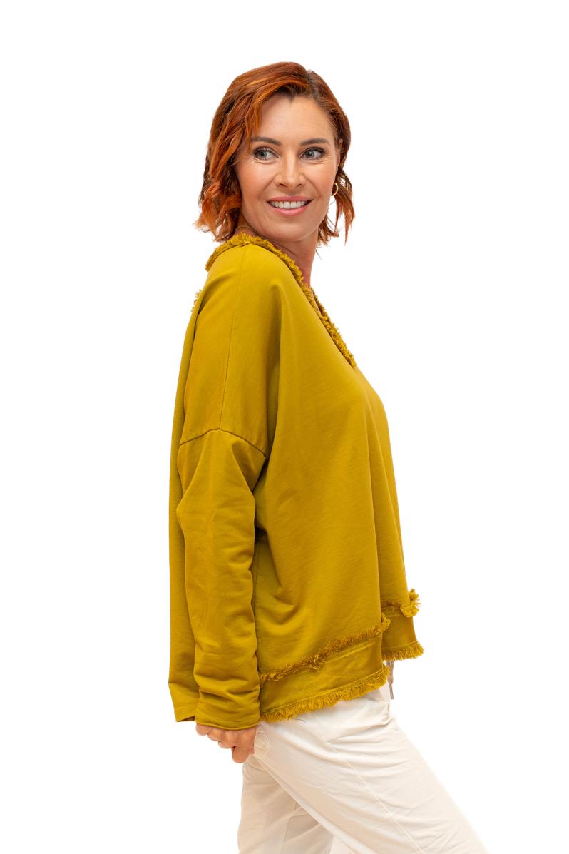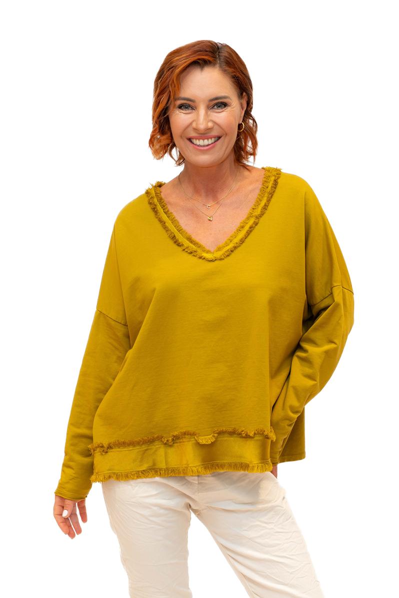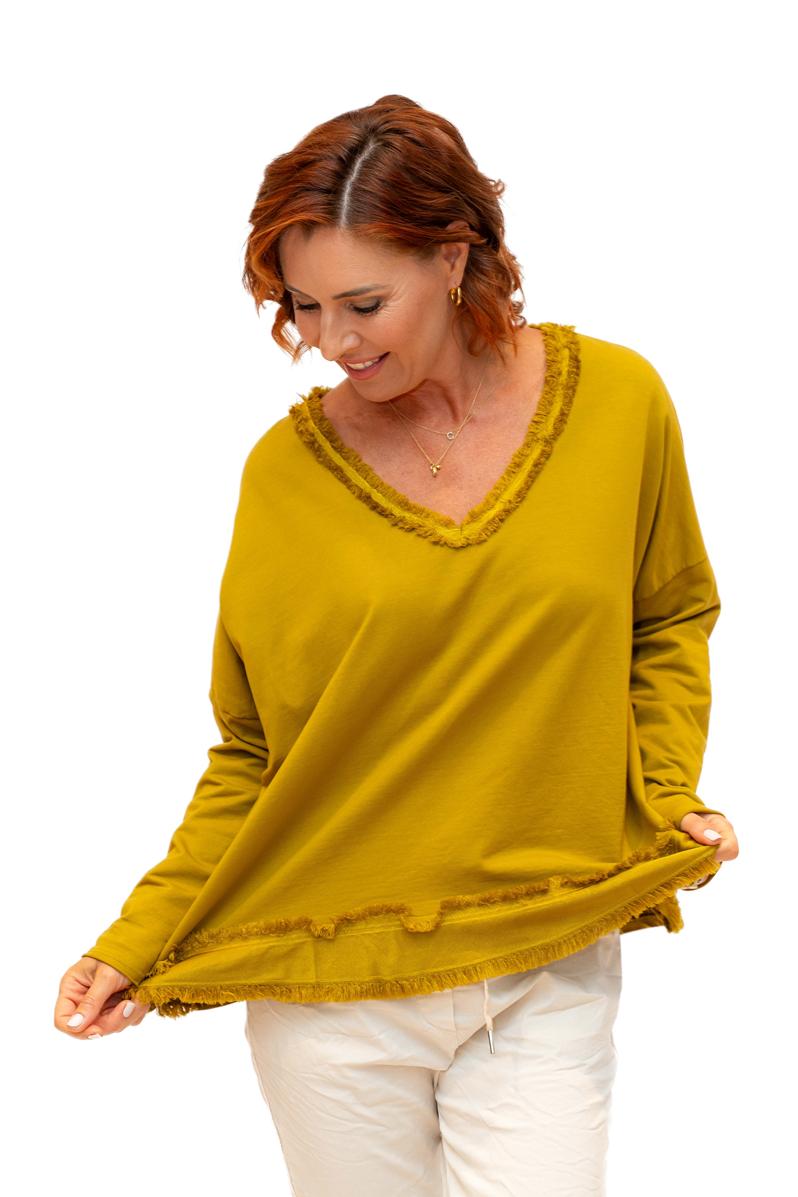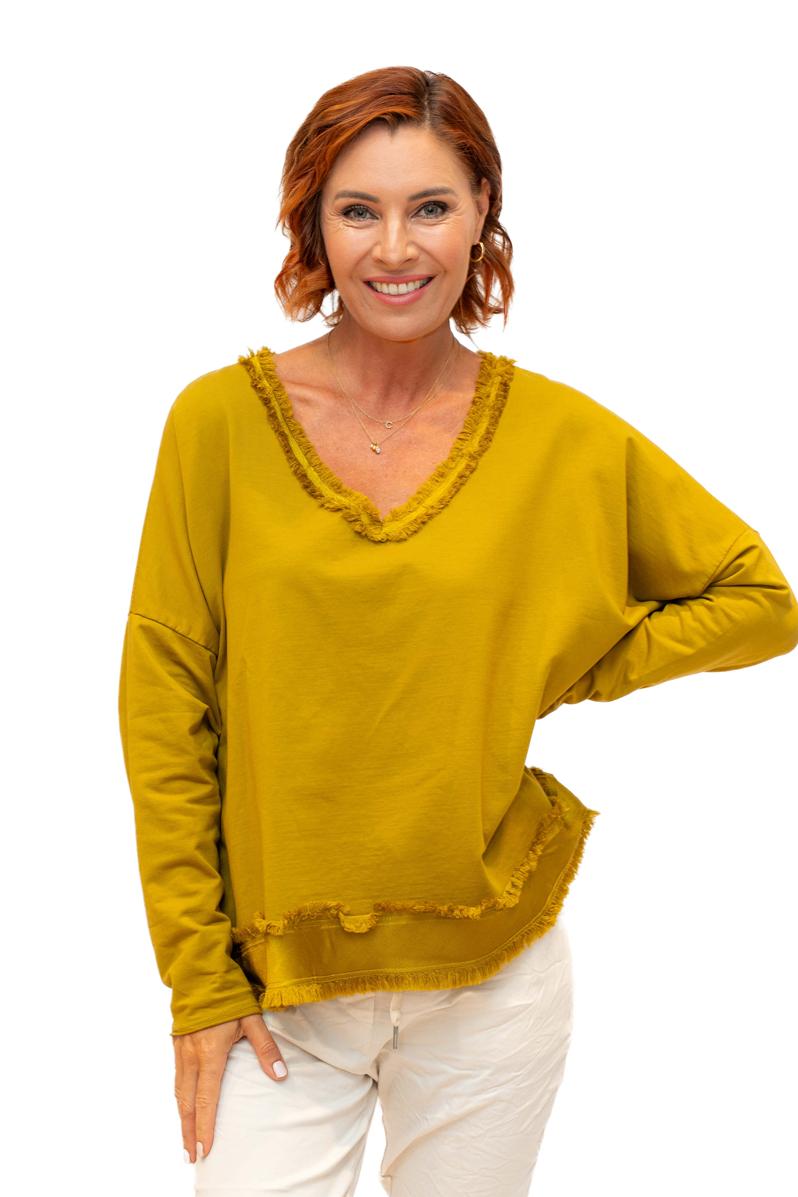 / Baker- Lime- V Neck Fray Trim Satin hem cotton L/S Top