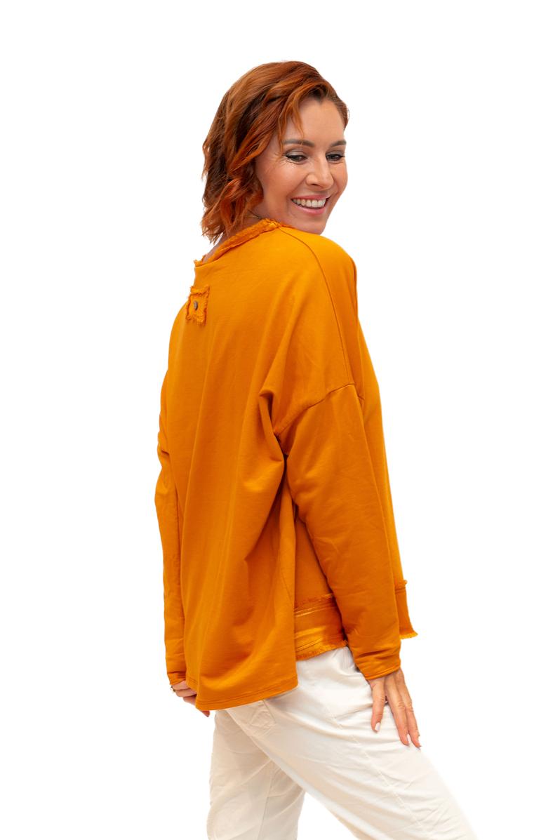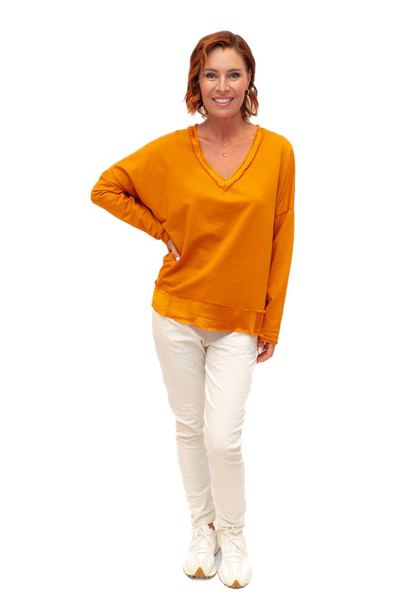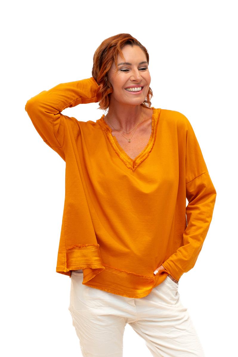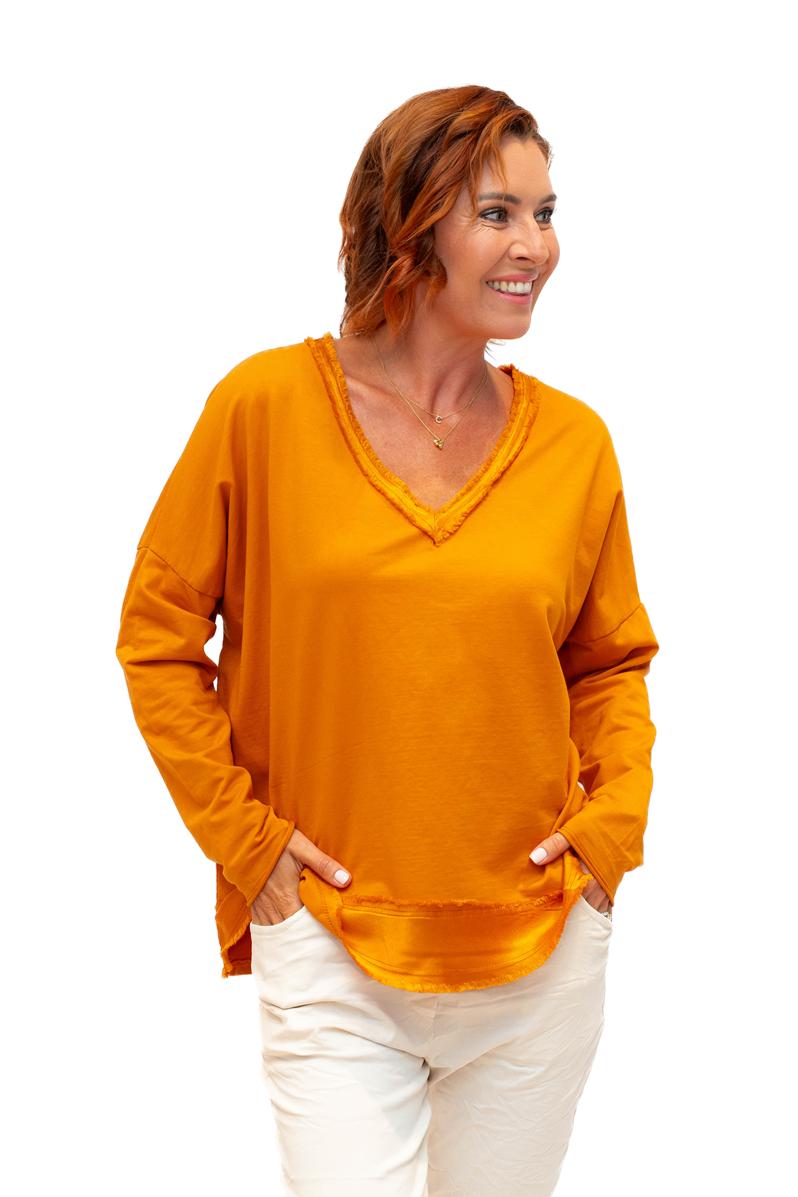 / Baker- Tangerine V Neck Fray Trim Satin hem cotton L/S Top