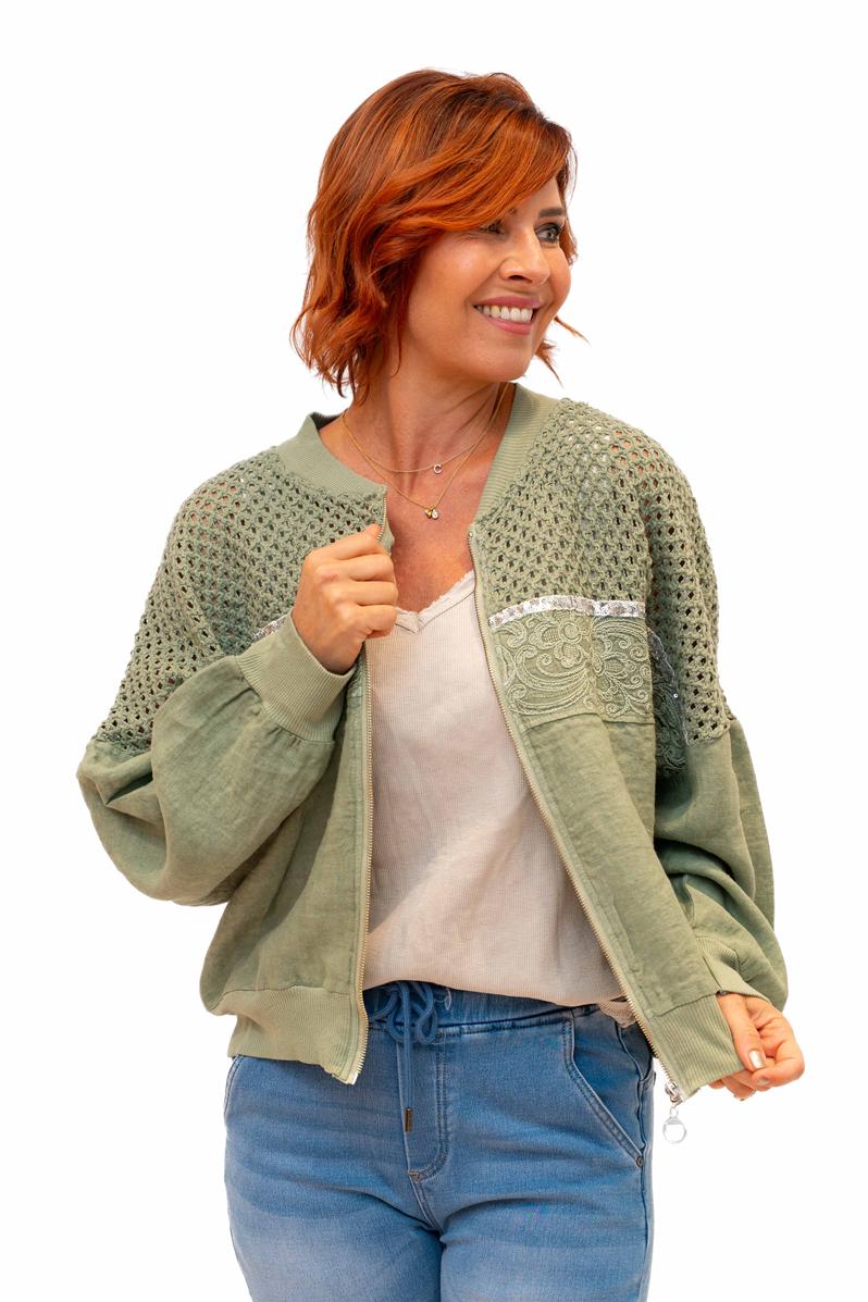 / Bayside Bomber-Khaki-Linen zip front bomber with mesh inserts