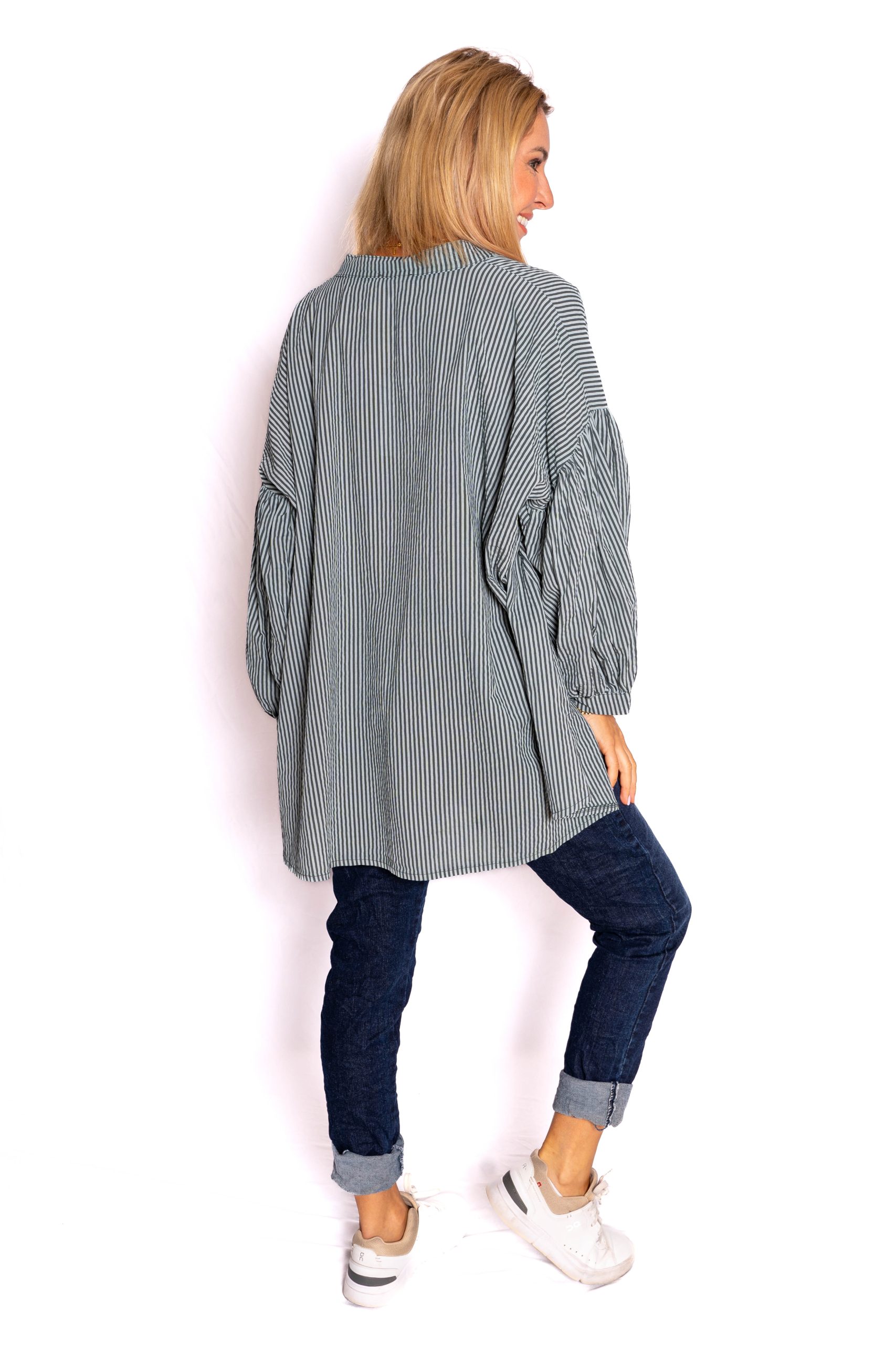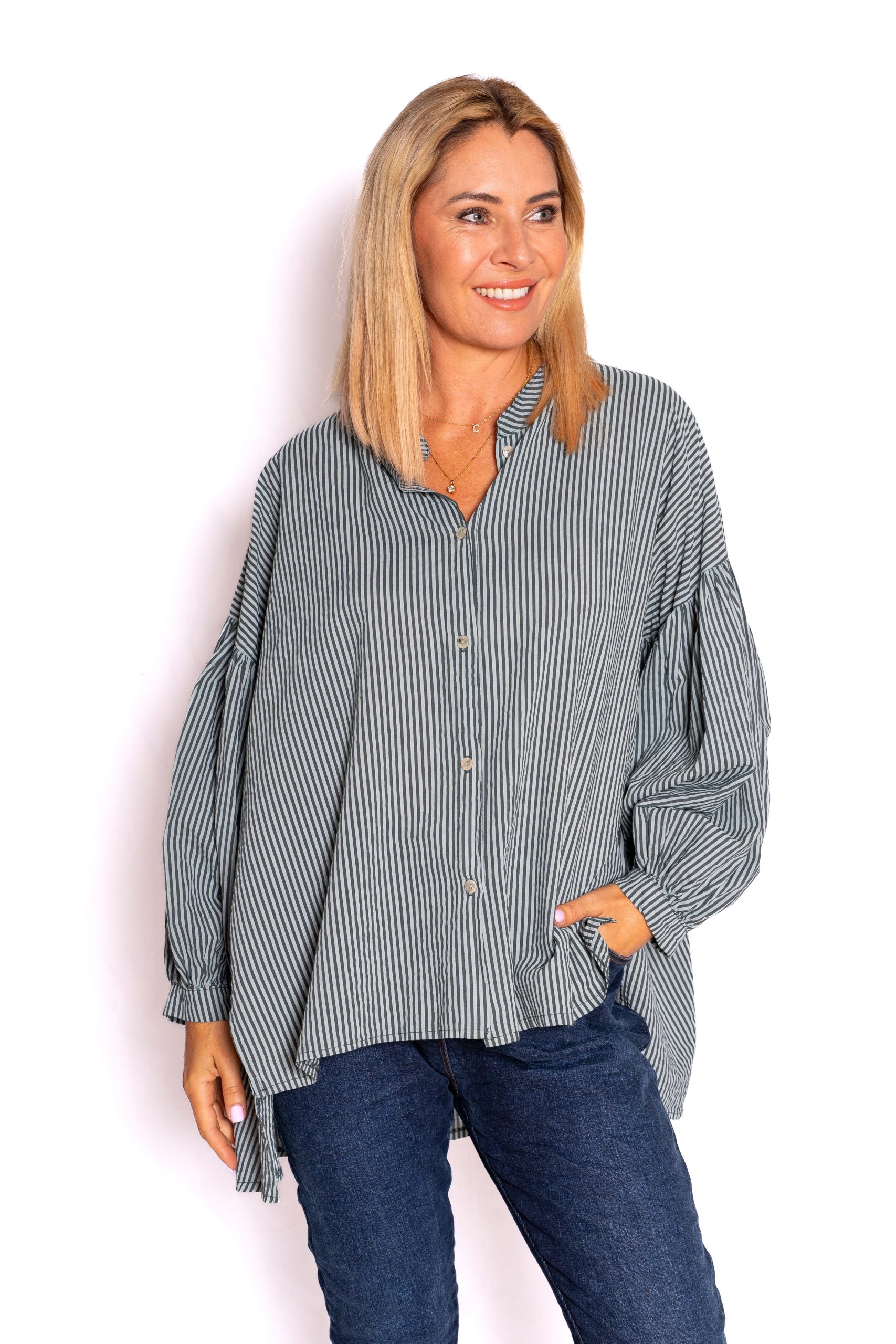 Berkley- Khaki Stripe Shirt with Balloon Sleeve | The Italian Closet