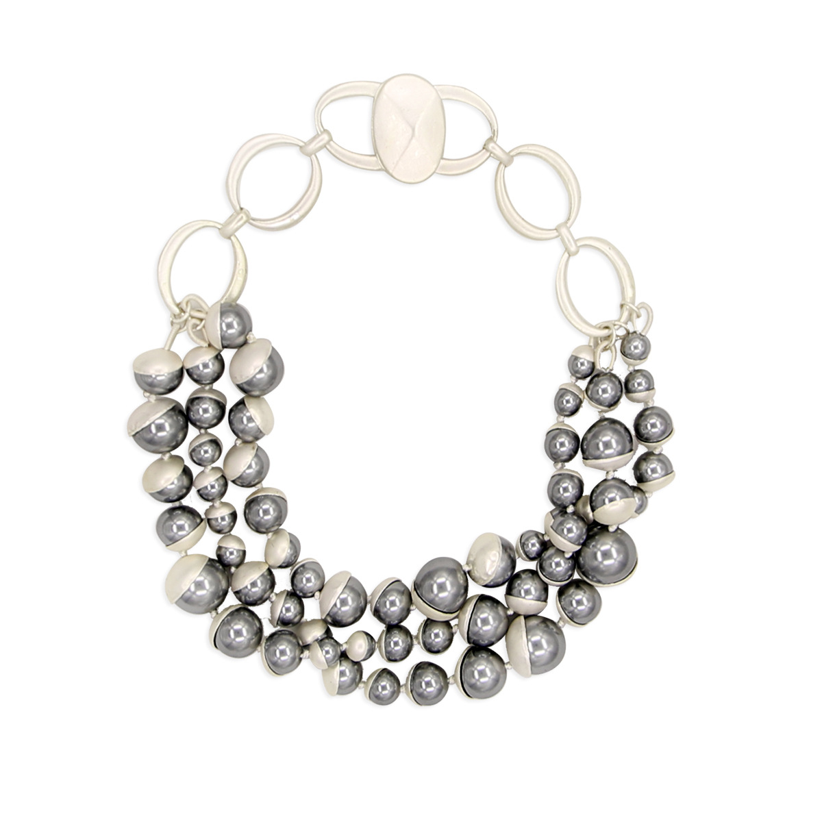 Three layer necklace of faux pearl with brushed silver tone alloy embellishments Feature clasp 45 cm length