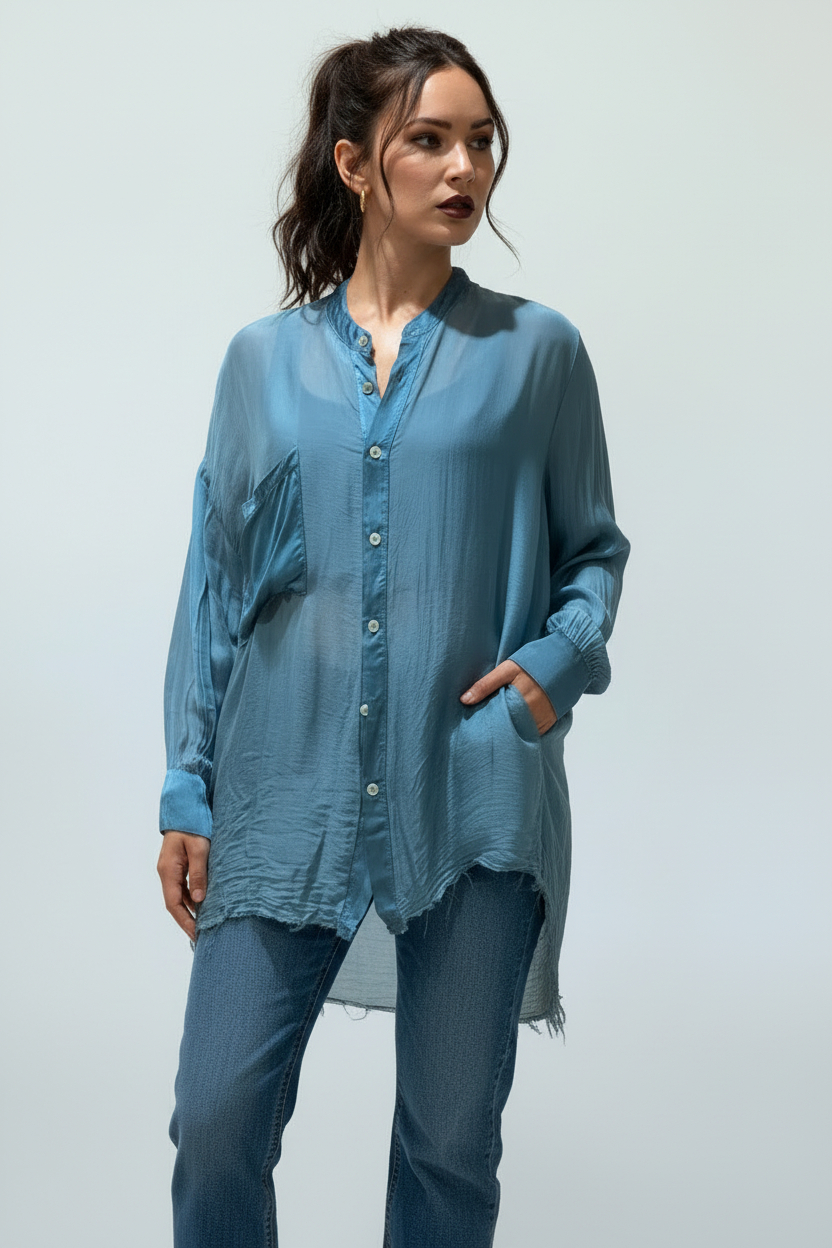 Celtine- Teal- Sheer silk Overshirt raw hem back gather quantity