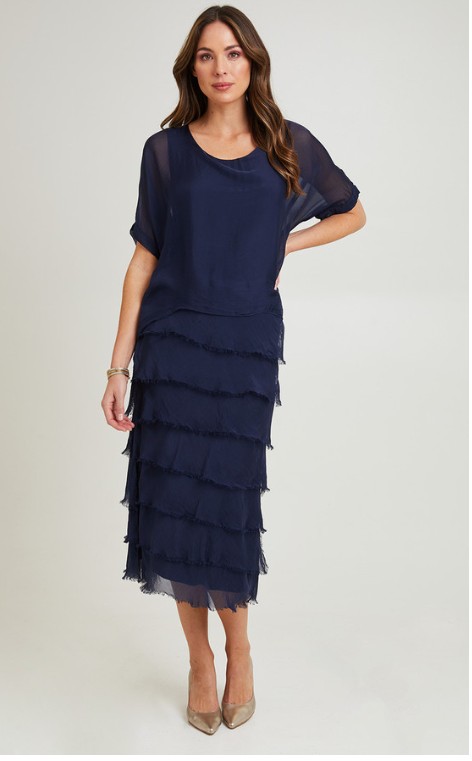 Elegance -Navy-Layered silk dress with batwing top quantity