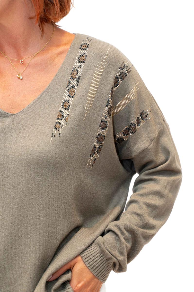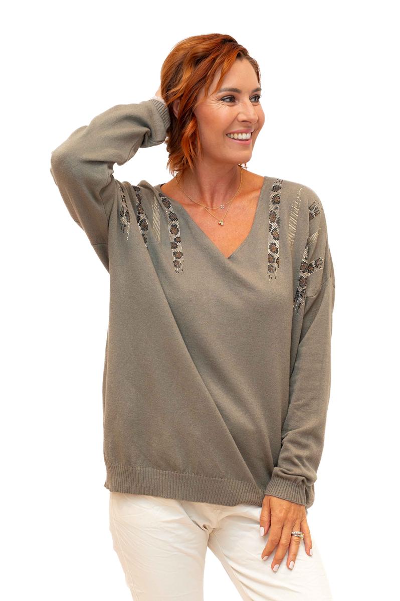 Ludo- Taupe- Soft knit v neck sweater with shoulder sparkles quantity