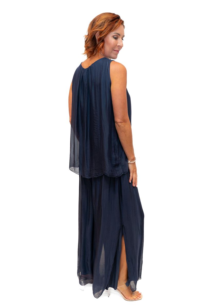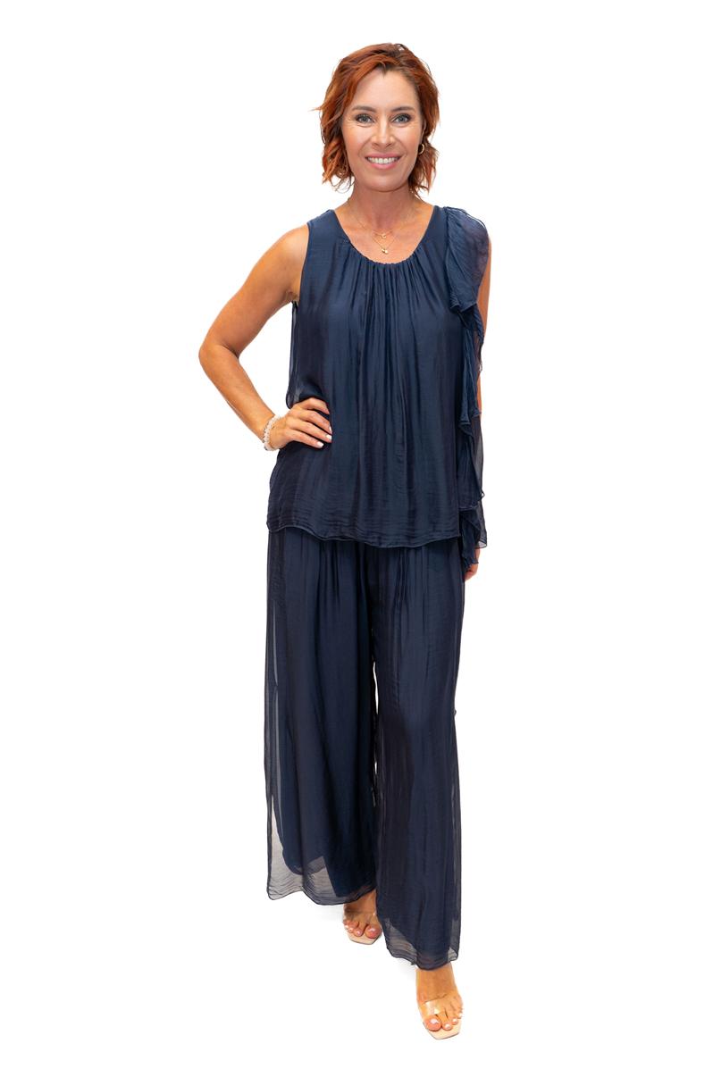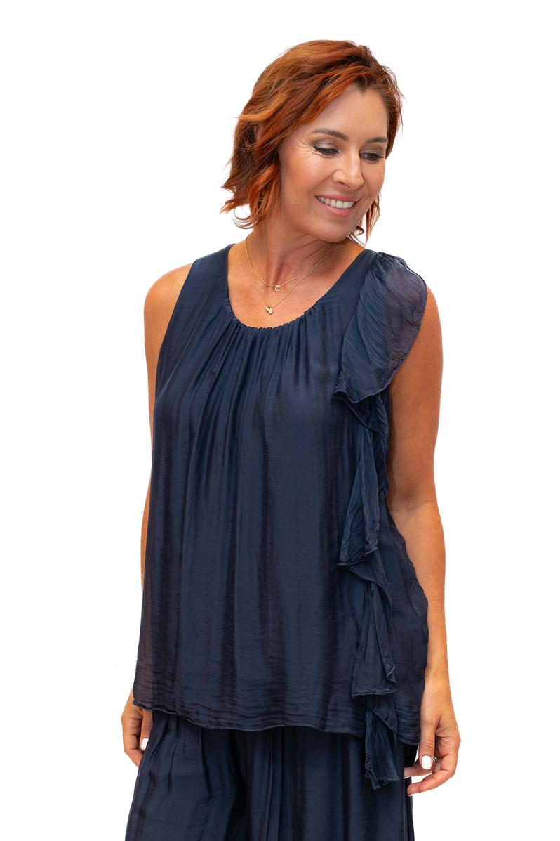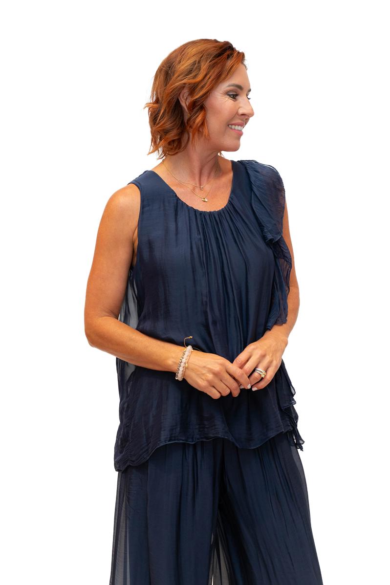 Martha- Navy O/S- Martha Long Silk Top with Ruffle