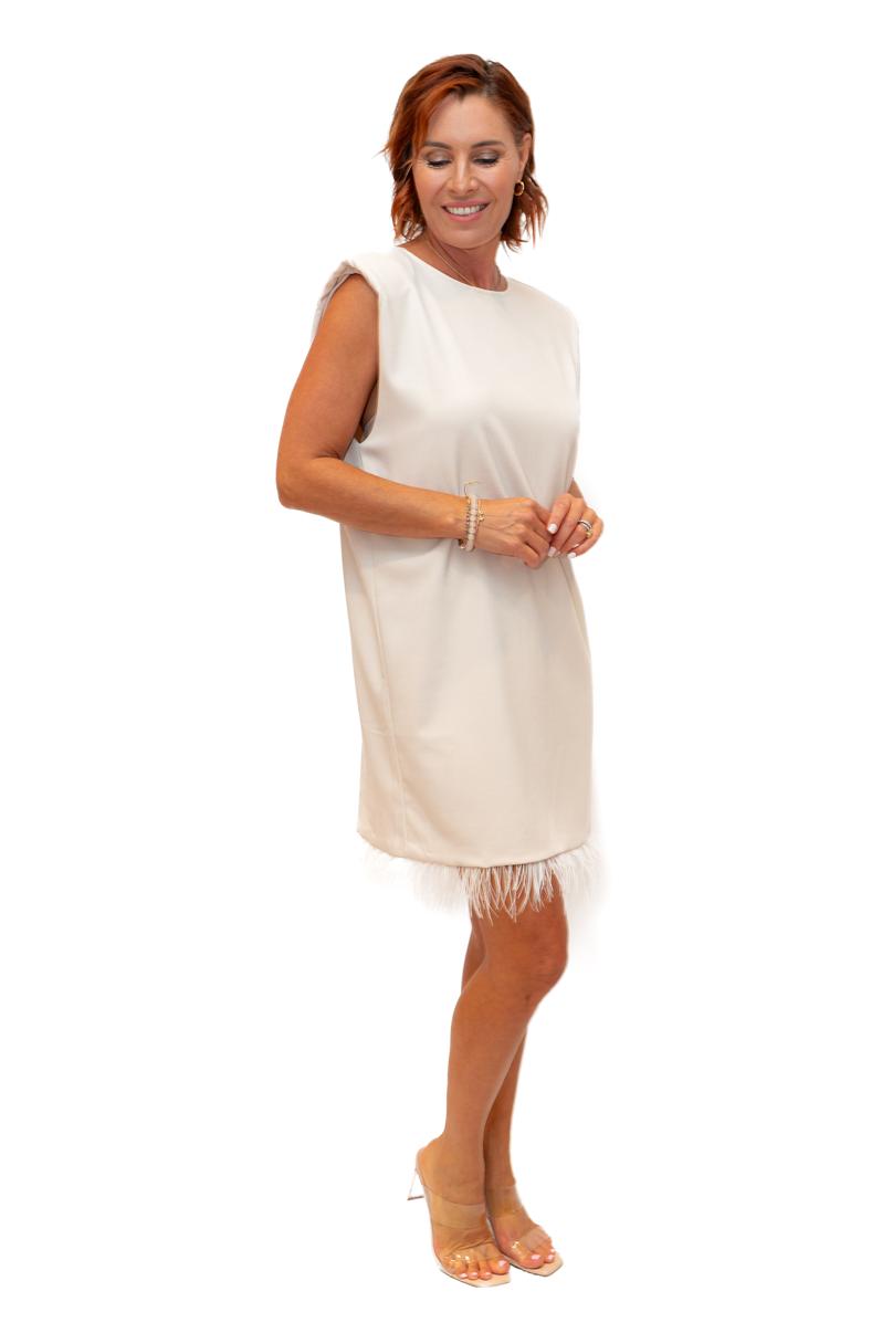 Shangrila- Cream- Woven scoop neck Dress with feather trim