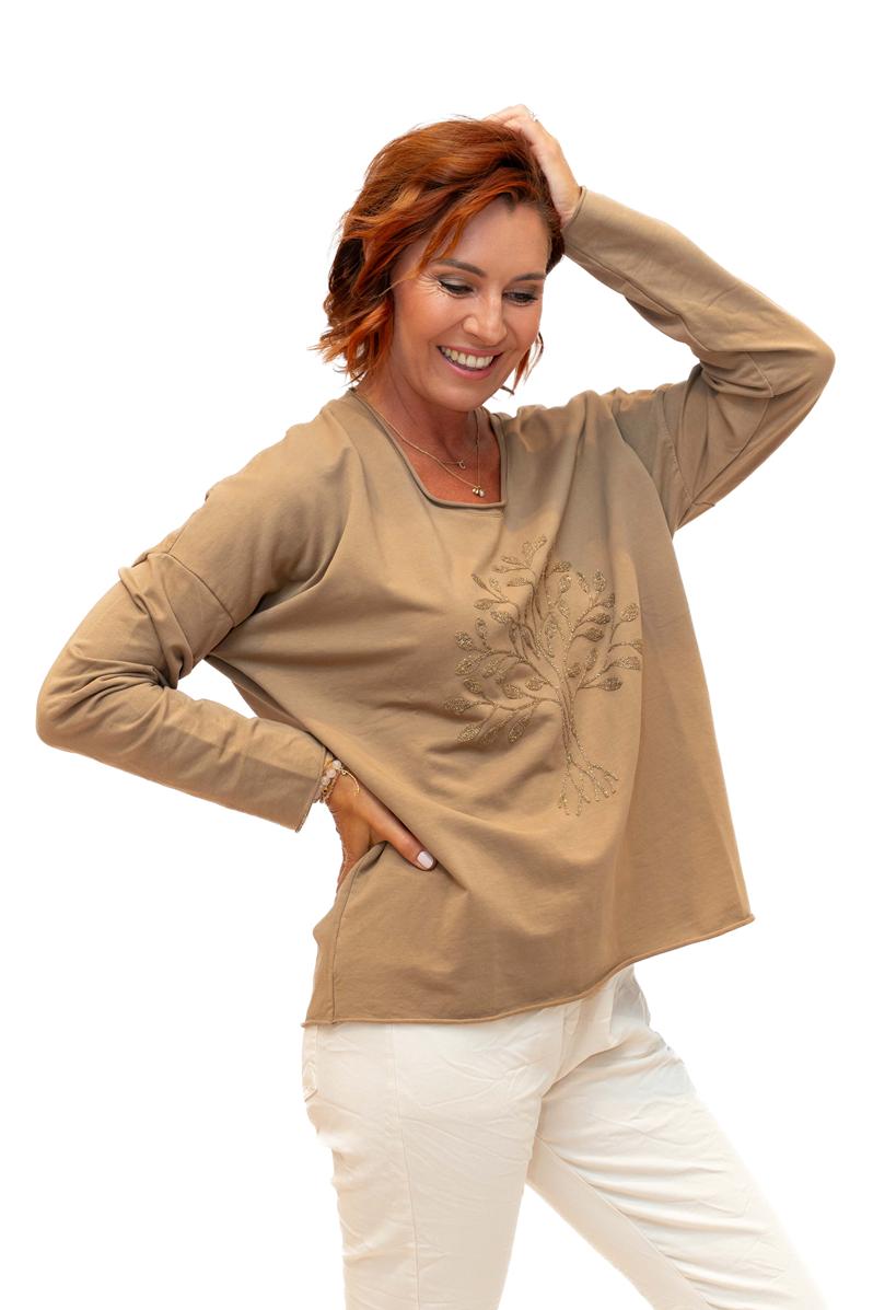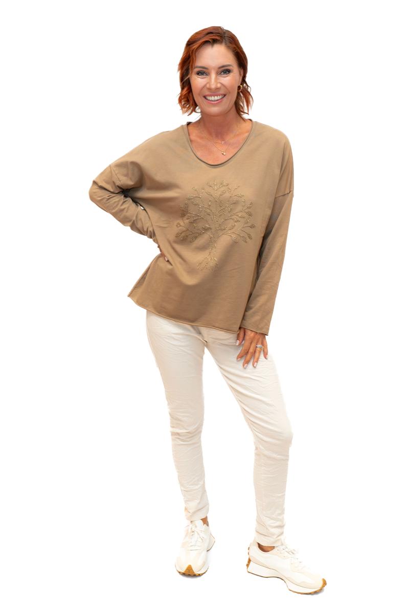 Trina- Camel- Cotton long sleeve T with tree embroidery quantity