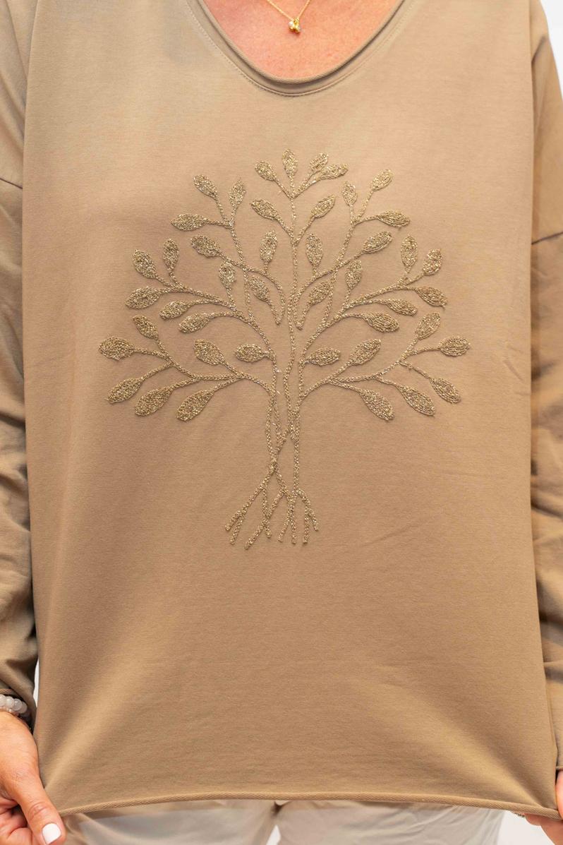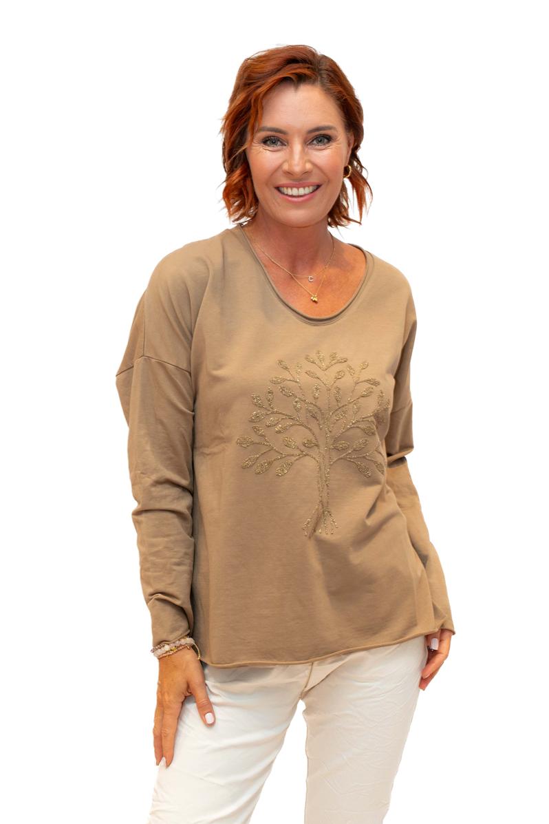 / Trina- Camel- Cotton long sleeve T with tree embroidery