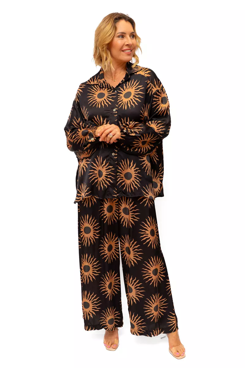 Westmont Shirt- Black/Orange- Silk Mix silky shirt with sun print quantity
